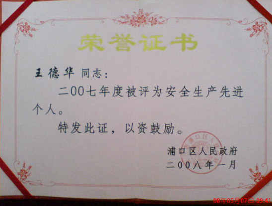 中昇建機王德華組長榮獲2007年度安全生產(chǎn)先進個人