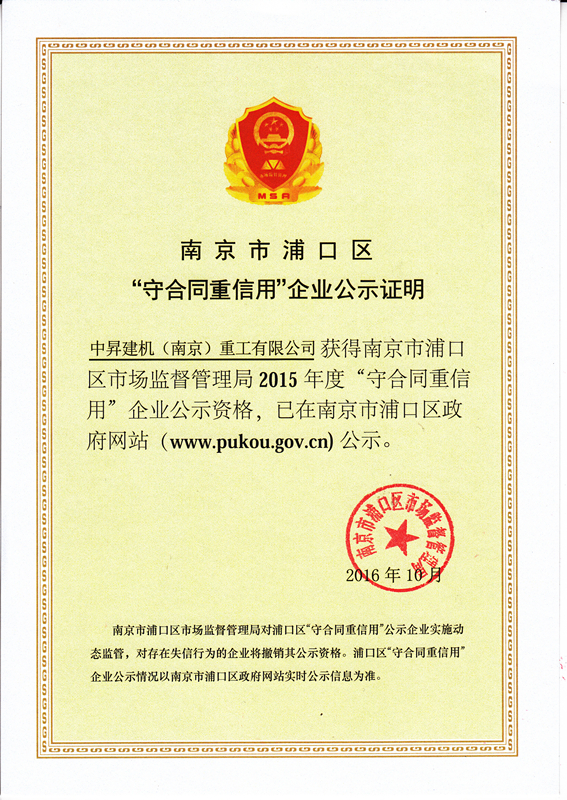 2016年10月,我公司獲得南京市浦口區(qū)市場監(jiān)督管理局2015年度“守合同重信用”企業(yè)公示資格,已在南京市浦口區(qū)政府網(wǎng)站(www.pukou.gov.cn)公示。