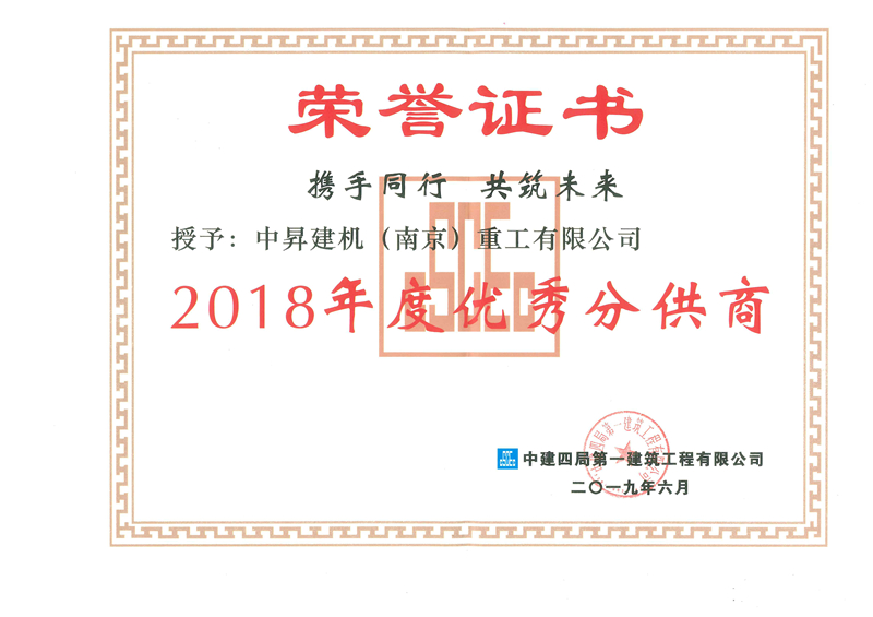 2019年7月,中昇建機代表應(yīng)邀出席中建四局第一建筑工程有限公司(以下簡稱“中建四局一公司”)“2019年項目建設(shè)總結(jié)表彰大會”,中昇建機以優(yōu)異的產(chǎn)品和服務(wù)在眾多供應(yīng)商中脫穎而出,榮獲“2018年度優(yōu)秀分供商”榮譽稱號。