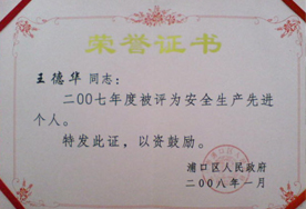 祝賀我司員工王德華組長榮獲浦口區(qū)2007年度安全生產(chǎn)先進個人 2008-05-07 |