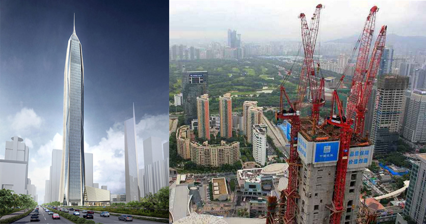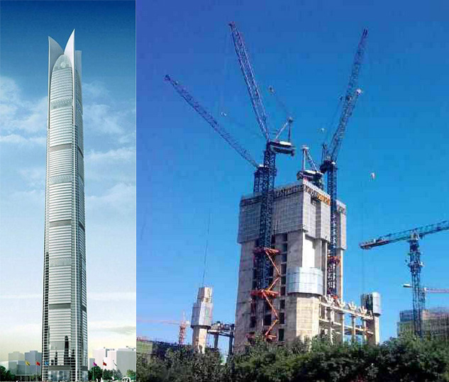 建筑主體高度592.5米,采用中昇建機(jī)ZSL2700(100T)兩臺(tái)。