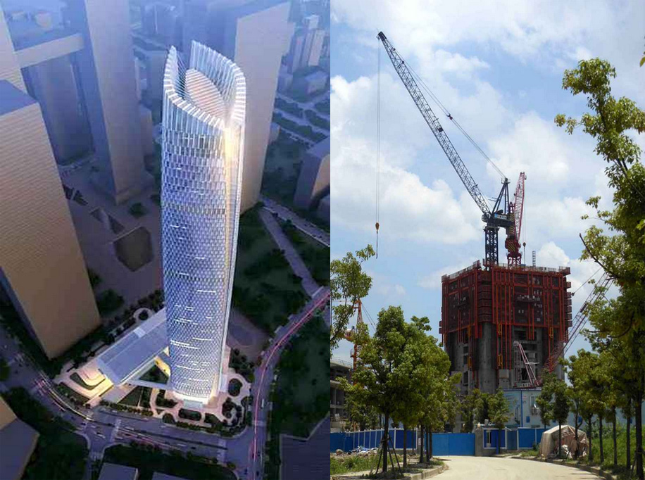 建筑主體高度438米,采用中昇建機(jī)ZSL1250(64T)及ZSL380(32T)各一臺(tái)。