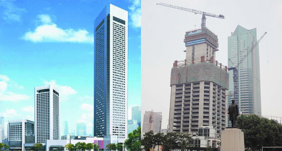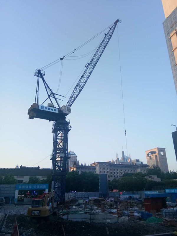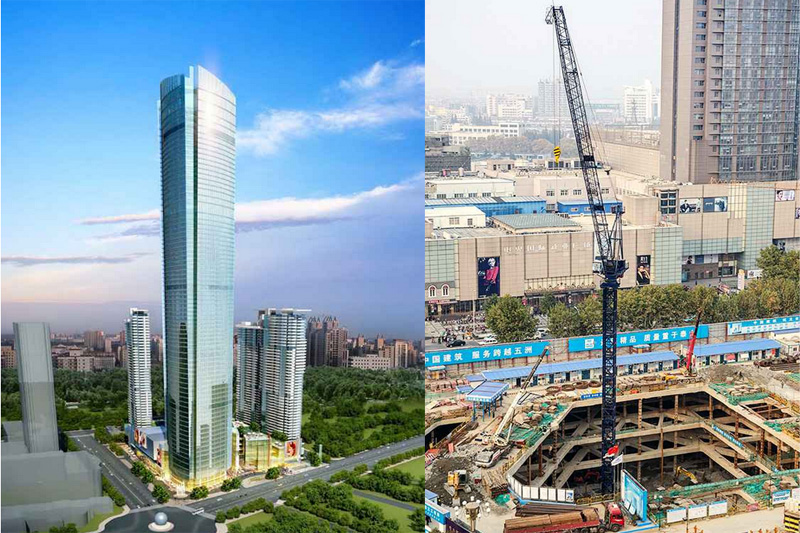 大樓高度208米,采用中昇建機(jī)ZSL1000一臺(最大吊重64t)和ZSL750一臺(最大吊重50t)。